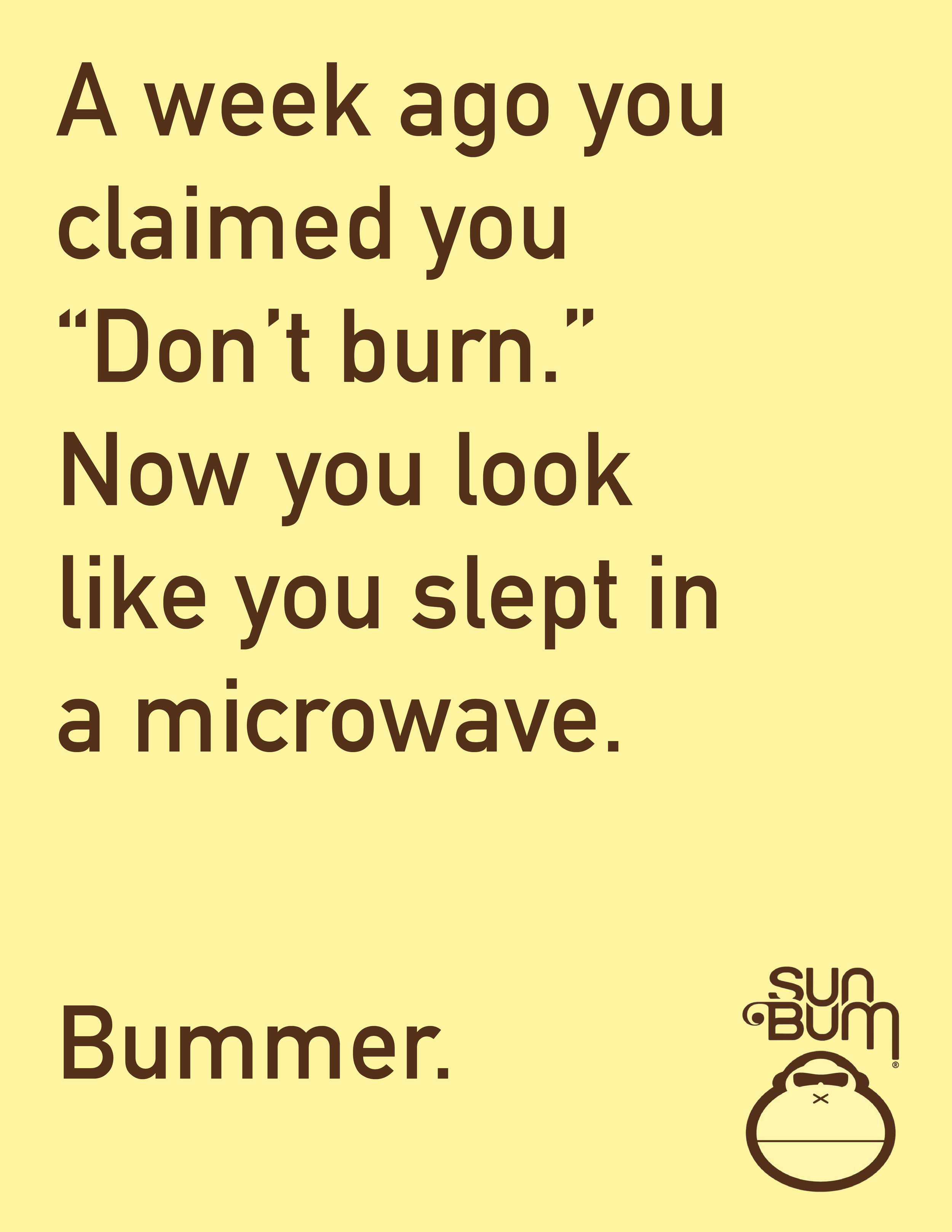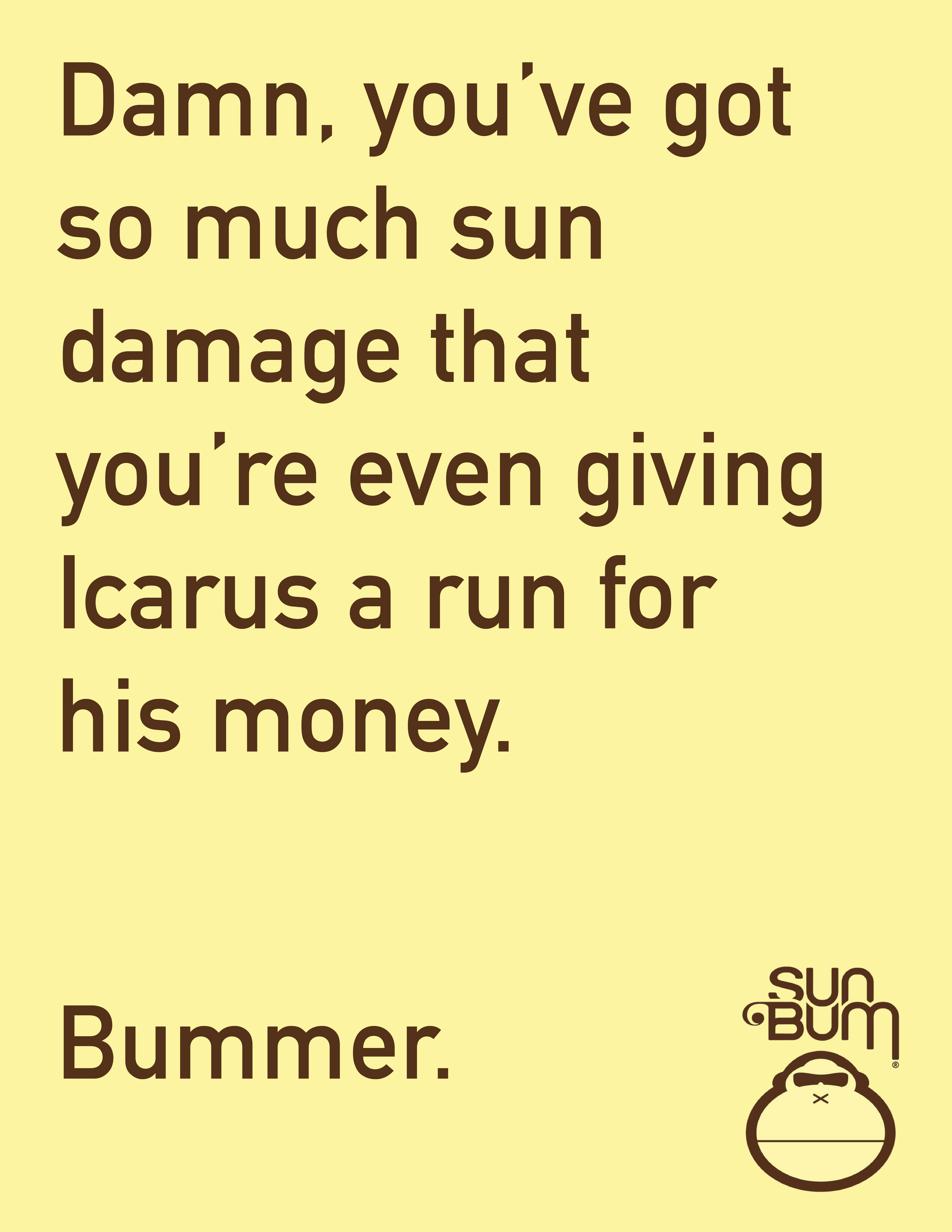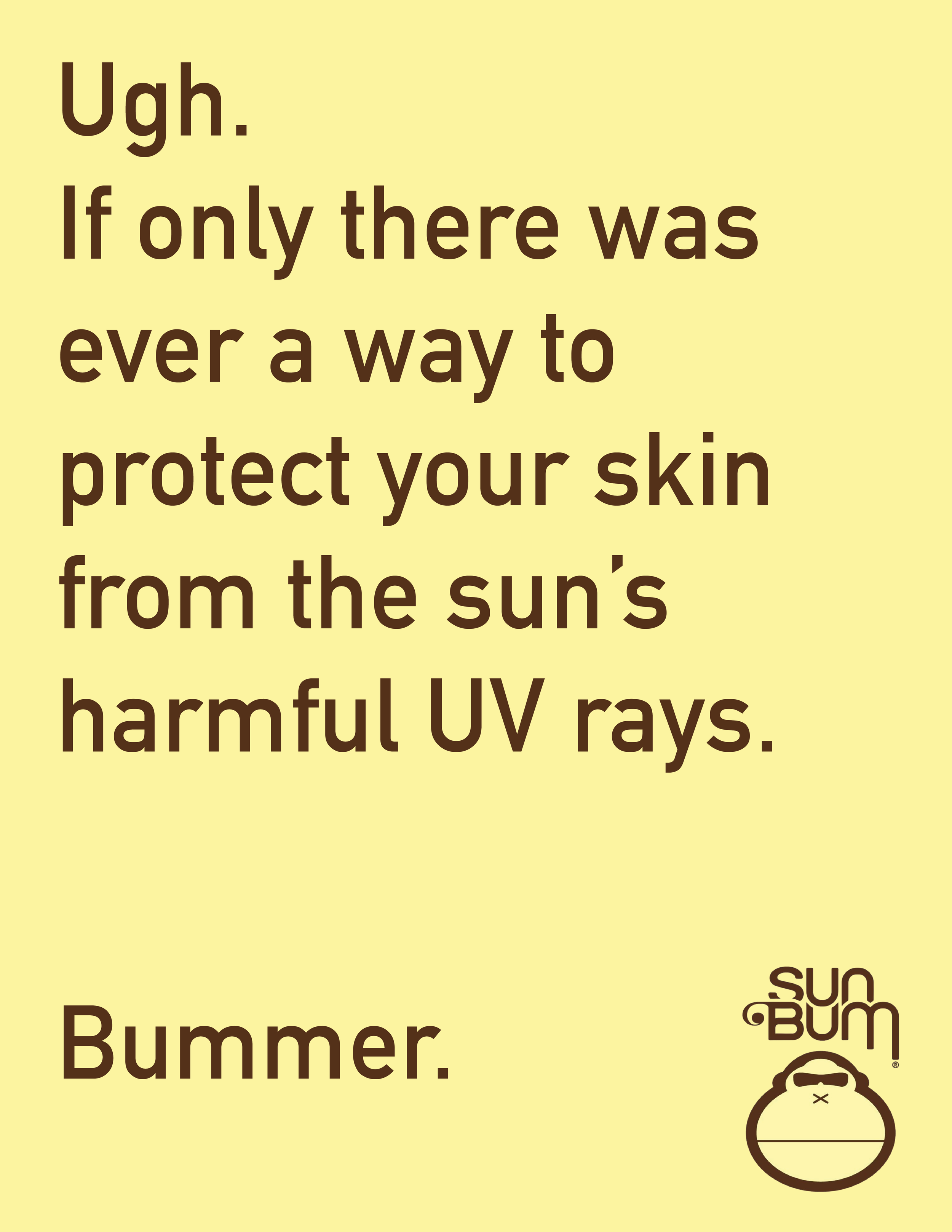 Sun Bum - BUMMER. Sun Bum - BUMMER. Sun Bum - BUMMER. Product: Sun Bum INSIGHT: People don’t take wearing sunscreen seriously enough.BIG IDEA: Mocking people who face the consequences of sun damage; Bummer. Print